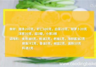 步骤1食材:面条200克,虾仁100克,白菜20克,胡萝卜20克,洋葱30克,蒜3瓣,小葱3根调味料:食用油8克,蚝油2克,老抽1克,海鲜酱油2克,鲍鱼汁2克,香油3克,椒盐2克,面粉10克,料酒2克 。步骤2虾仁加入料酒、椒盐、面粉,拌匀...