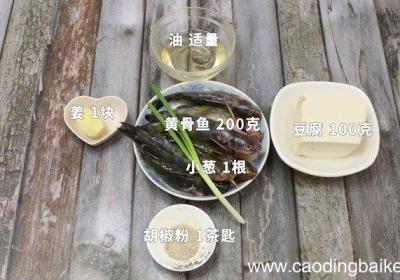 步骤1准备食材:黄骨鱼200克、豆腐100克、小葱1根、胡椒粉1茶匙、油适量、姜1块 。步骤2黄骨鱼洗净打花刀 。步骤3豆腐切块 。步骤4小葱切葱花 。步骤5姜切片 。步骤6首先起锅倒油,油热放少许盐,下入黄骨鱼煎至两面微黄 。步骤7然后放...