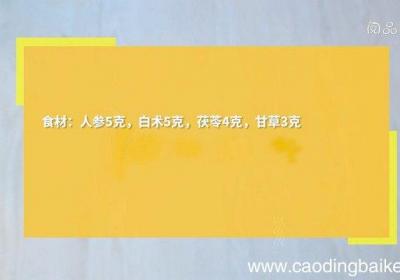 步骤1食材:人参5克,白术5克,茯苓4克,甘草3克 。步骤2人参用清水洗净 。步骤3白术用清水洗净 。步骤4茯苓用清水洗净 。步骤5甘草用清水洗净 。步骤6砂锅中加入300毫升纯净水,放入人参,白术,茯苓,甘草,煮沸后,小火煎熬40分钟,倒...