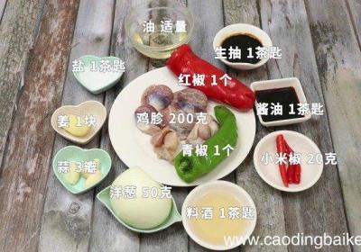 步骤1准备食材:鸡胗200克、油适量、盐1茶匙、姜1块、蒜3瓣、生抽1茶匙、酱油1茶匙、料酒1茶匙、小米椒20克、洋葱50克、青椒1个、红椒1个 。步骤2鸡胗切片 。步骤3姜切片 。步骤4蒜切片 。步骤5小米椒切圈 。步骤6【爆炒鸡胗怎么做...