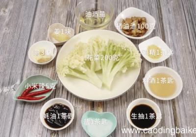 步骤1准备食材:花菜200克、猪油渣100克、蒜3瓣、姜1块、小米辣5克、油适量、盐1茶匙、鸡精1茶匙、料酒1茶匙、生抽1茶匙、蚝油1茶匙 。步骤2花菜洗净切块 。步骤3蒜切片 。【猪油渣花菜 猪油渣花菜的做法】 步骤4姜切片 。步骤5小米...