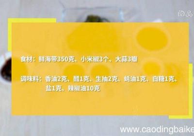 步骤1食材:鲜海带350克、小米椒3个、大蒜3瓣、香油2克、醋1克、生抽2克、蚝油1克、白糖1克、盐1克、辣椒油10克 。【凉拌海带片的做法 凉拌海带片怎么做】步骤2鲜海带用温水浸泡30分钟,切片 。步骤3锅中倒入清水,放入海带,煮8分钟,...
