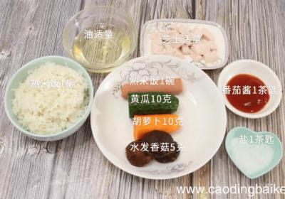 步骤1准备食材:熟米饭1碗、芝士适量、胡萝卜10克、番茄酱1茶匙、水发香菇5克、黄瓜10克、火腿肠10克、油适量、盐1茶匙 。步骤2胡萝卜洗净切丁 。步骤3香菇洗净切丁 。步骤4火腿肠切丁 。步骤5黄瓜切丁 。步骤6起锅倒油,油热加入胡萝卜...