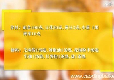 步骤1面条100克、豆腐花50克、黄豆3克、小葱1根、芝麻酱1汤匙、红油辣椒2汤匙、花椒粉半汤匙、生抽2汤匙、甘薯粉1汤匙 。步骤2小葱切葱花 。步骤3甘薯粉加清水搅散 。步骤4锅中加水烧沸,倒入甘薯粉浆搅成芡汁,将豆花放入芡汁中煮熟 。步...