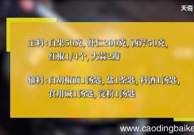 步骤1所需食材:白果50克,虾仁200克,西芹50克,红椒14个,大蒜2瓣 。所需调料:白胡椒面1汤匙,盐1茶匙,料酒1汤匙,食用碱1汤匙,淀粉1汤匙 。步骤2白果洗净用清水泡发1小时 。步骤3西芹斜切 。步骤4红椒斜切 。步骤5虾仁加食用...