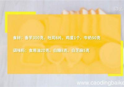 步骤1食材:香芋300克、吐司8片、鸡蛋1个、牛奶50克 。调味料:食用油20克、白糖8克、白芝麻5克 。步骤2芋头切块,放入蒸锅,蒸30分钟 。步骤3取出,压成泥,加入牛奶、白糖,拌匀 。步骤4吐司片切去四边,用擀面杖擀薄 。步骤5鸡蛋蛋...