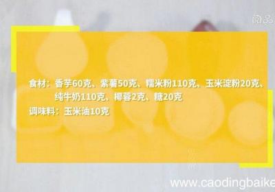 步骤1食材:香芋60克、紫薯50克、糯米粉110克、玉米淀粉20克、纯牛奶110克、椰蓉2克、糖20克、玉米油10克 。步骤2香芋、紫薯,放入蒸锅 。步骤3蒸熟后取出,压成泥,混合均匀 。步骤4取大碗,放入糯米粉、糖、牛奶、玉米淀粉、玉米油...