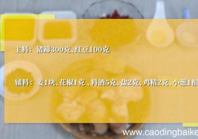 步骤1主料:猪蹄300克、红豆100克 。辅料:姜1块、小葱1根、花椒1克、料酒5克、盐2克、鸡精2克 。步骤2红豆提前浸泡24小时 。【红豆炖猪脚怎么做 红豆炖猪脚的做法】步骤3姜切片 。步骤4葱切葱花 。步骤5锅中放入适量清水,放入姜片...