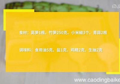 步骤1食材:莴笋1根、竹笋250克、小米椒3个、青蒜2根 。调味料:食用油5克、盐1克、鸡精2克、生抽2克 。步骤2莴笋去皮,切片 。步骤3小米椒切小圈 。步骤4青蒜切段 。步骤5竹笋切长条 。步骤6炒锅中油温5成热时,下入莴笋片,翻炒1分...