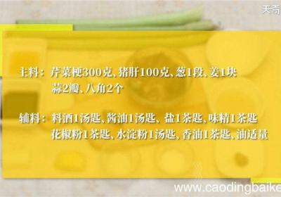 步骤1准备食材:芹菜梗300克,猪肝100克,料酒1汤匙,酱油1汤匙,盐1茶匙,味精1茶匙,葱1段,姜1块,蒜2瓣,八角2个,花椒粉1茶匙,淀粉1汤匙,香油1茶匙、油适量 。步骤2葱切段,姜切片,蒜切片,芹菜梗斜切成段 。步骤3猪肝切片,用...