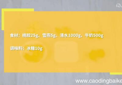 步骤1准备食材:桃胶25g、雪燕5g、清水1000g、牛奶500g、冰糖10g 。步骤2桃胶和雪燕用清水提前浸泡12小时 。步骤3将浸泡好的桃胶和雪燕去掉杂质洗净备用 。步骤4锅中加入清水,将桃胶、雪燕放入 。大火烧开后转小火炖40分钟 。...