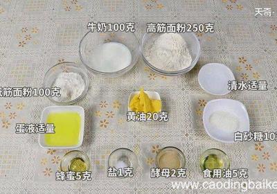 步骤1准备食材:高筋面粉250克、低筋面粉100克、酵母2克、蛋液适量、牛奶100克、黄油20克、白砂糖10克、蜂蜜5克、食用油5克、盐1克、清水适量 。步骤2首先把酵母、牛奶、蛋液、糖、盐 、蜂蜜倒入搅拌桶中 。步骤3再加入高粉、低粉、水...