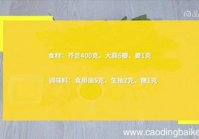 步骤1食材:芥兰400克、大蒜6瓣、姜1克 。调味料:食用油5克、生抽2克、糖1克 。步骤2芥兰摘去叶子,洗净,切片 。步骤3大蒜切末 。步骤4姜切末 。步骤5热锅倒油,油温5成热时,下姜、蒜,爆香 。倒入芥兰,翻炒至芥兰变软,调入生抽、糖...