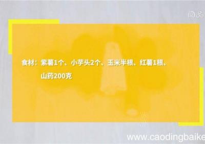 步骤1食材:紫薯1个、小芋头2个、玉米半根、红薯1根、山药200克 。步骤2紫薯对半切块 。步骤3芋头洗净 。步骤4玉米切段,红薯切厚块 。步骤5山药洗净,切段 。【五谷丰登的做法 五谷丰登怎么做】 步骤6将所有食材放蒸锅,水沸后,蒸20分...