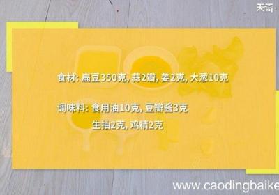 步骤1食材:扁豆350克,蒜2瓣,姜2克,大葱10克调味料:食用油10克,豆瓣酱3克,生抽2克,鸡精2克步骤2扁豆去筋,洗净 。步骤3蒜切片 。步骤4姜切片 。【扁豆角的做法 扁豆角怎么做】步骤5大葱切片 。步骤6热锅倒油,油温5成热时,下...