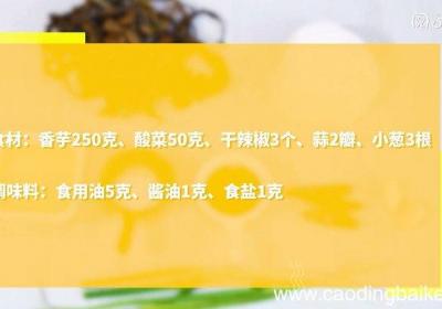 步骤1食材:香芋250克、酸菜50克、干辣椒3个、蒜2瓣、小葱3根 。调味料:食用油5克、酱油1克、食盐1克 。步骤2【酸菜炒芋丝怎么做 酸菜炒芋丝的做法】香芋切丝 。步骤3酸菜切末 。步骤4干辣椒切段 。步骤5大蒜切片 。步骤6小葱切段...