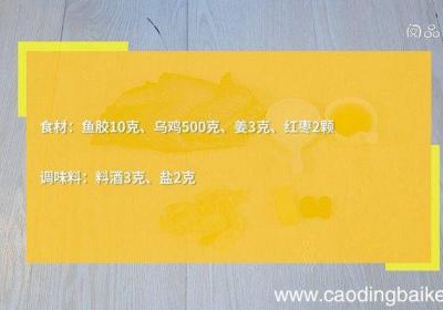 步骤1食材:鱼胶10克,乌鸡500克,姜3克,红枣2颗、料酒3克,盐2克 。【乌鸡鱼胶汤的做法 乌鸡鱼胶汤怎么做】 步骤2鱼胶用清水泡发24小时,变软后捞出 。步骤3砂锅中放入鸡肉、鱼胶、姜、1升清水、料酒,煮沸后,撇去浮沫,转中小火炖煮2...