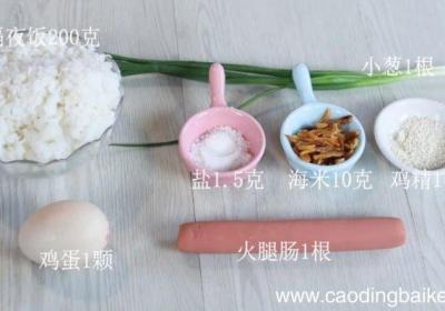 步骤1主料:海米10克、火腿肠1根、鸡蛋1颗、隔夜饭200克 。辅料:盐1.5克、鸡精1克、小葱1根 。步骤2海米洗净放入温水中浸泡20分钟 。步骤3火腿肠切丁 。步骤4葱切葱花 。步骤5鸡蛋打入碗中调入盐0.5克搅拌均匀 。步骤6锅中放入...