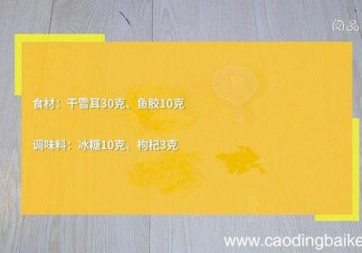 步骤1食材:干雪耳30克,鱼胶10克、冰糖10克,枸杞3克 。步骤2鱼胶用清水泡发24小时,变软后捞出 。步骤3干雪耳用清水泡发6小时,捞出 。炖盅里放入鱼胶、雪耳、冰糖、200毫升清水,放入蒸锅,蒸90分钟,再加入枸杞,蒸30分钟,取出...