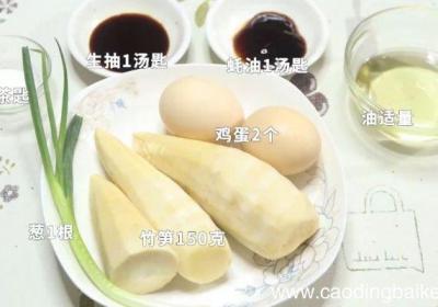 步骤1主料:竹笋150克、鸡蛋2个 。辅料:盐1茶匙、生抽1汤匙、蚝油1汤匙、葱1根、油适量 。步骤2竹笋切片 。步骤3葱切葱花 。步骤4碗中打入鸡蛋搅散 。步骤5油锅烧热,放入鸡蛋炒熟盛出 。步骤6另起锅,放少许油,再放入竹笋翻炒均匀 。...