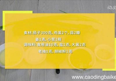 步骤1食材:茄子300克,鸡蛋2个,蒜2瓣,姜1克,小葱1根 。调味料:食用油10克,盐1克,大酱2克,老抽1克,胡椒粉1克 。步骤2茄子切小块 。步骤3蒜对半切开 。步骤4姜切片 。步骤5小葱切葱花 。步骤6鸡蛋打散 。步骤7锅中油温6成...