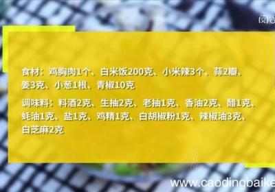 步骤1食材:鸡胸肉1个,白米饭200克,小米辣3个,蒜2瓣,姜3克,小葱1根,青椒10克 。调味料:料酒2克,生抽2克,老抽1克,香油2克,醋1克,蚝油1克,盐1克,鸡精1克,白胡椒粉1克,辣椒油3克,白芝麻2克 。步骤2小米辣切末,1克姜...