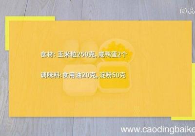 步骤1食材:玉米粒250克,咸鸭蛋2个 。调味料:食用油20克,淀粉50克 。步骤2【咸蛋黄煎玉米的做法 咸蛋黄煎玉米怎么做】咸鸭蛋剥壳,取出蛋黄,放入碗中,压碎 。步骤3碗中放入玉米粒,再倒入淀粉,拌匀,使每粒玉米都沾上淀粉 。步骤4热锅...