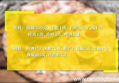 步骤1材: 猪蹄500克、 生姜1块、丁香5克、八角1个、 桂皮1块、香叶3片、啤酒1罐 。辅料: 料酒1勺、冰糖25克、醋1勺、花椒5克、生抽1勺、 辣椒面5克、孜然粉5克 。步骤2姜切片 。步骤3猪蹄洗净切成块 。步骤4猪蹄冷水下锅,加...