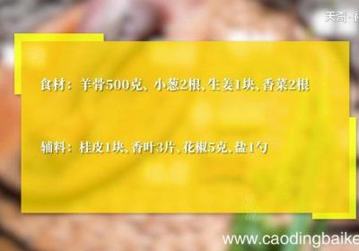 步骤1【羊骨汤的做法 羊骨汤怎么做】食材: 羊骨500克、 小葱2根、生姜1块、香菜2根 。辅料: 桂皮1块、香叶3片、花椒5克、盐1勺 。步骤2羊骨洗净切块 。步骤3姜拍碎 。步骤4小葱切葱花 。步骤5香菜切末 。步骤6羊骨用冷水浸泡2小...