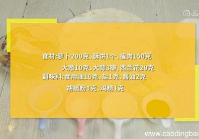 步骤1食材:萝卜200克、酥饼1个、瘦肉150克、大葱10克、大蒜3瓣、西兰花20克、食用油10克、盐1克、酱油2克、胡椒粉1克、鸡精1克 。步骤2萝卜切丝 。步骤3酥饼切丝 。步骤4瘦肉切丝 。步骤5大葱切丝 。步骤6大蒜切末 。【萝卜肉...