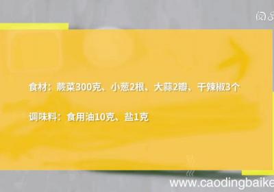 步骤1准备食材:蕨菜300克、小葱2根、大蒜2瓣、干辣椒3个、食用油10克、盐1克 。步骤2锅中水沸、下蕨菜、焯水30秒、捞出 。步骤3蕨菜沥干水分、切成段 。步骤4小葱切段 。步骤5大蒜拍碎 。步骤6干辣椒切小段 。步骤7热锅倒油、油温5...