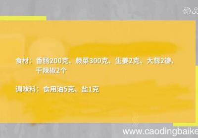 步骤1准备食材:香肠200克、蕨菜300克、生姜2克、大蒜2瓣、干辣椒2个、食用油5克、盐1克 。步骤2锅中水沸、下蕨菜、焯水30秒、捞出 。步骤3蕨菜沥干水分、切成段 。步骤4香肠切片 。步骤5生姜切丝 。步骤6大蒜拍碎、切末 。步骤7干...