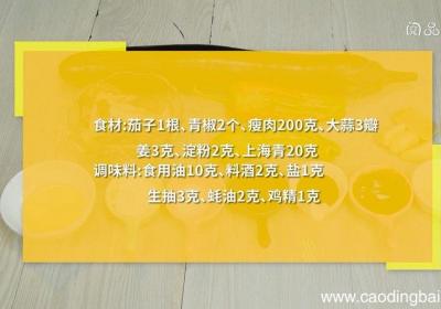 步骤1食材:茄子1根、青椒2个、瘦肉200克、大蒜3瓣、姜3克、淀粉2克、上海青20克、食用油10克、料酒2克、盐1克、生抽3克、蚝油2克、鸡精1克 。步骤2瘦肉切片 。步骤3加入料酒、淀粉 。步骤4拌匀腌制10分钟 。步骤5茄子切长条 。...