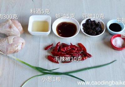 步骤1准备食材:鸡肉300克、干辣椒10克、豆豉10克、小葱1根、盐1克、生抽10克、蚝油5克、料酒5克 。步骤2鸡肉洗净切块放入碗中 。步骤3调入盐1克、生抽10克、蚝油5克、料酒5克搅拌均匀,腌制10分钟 。步骤4干辣椒切碎 。步骤5豆...