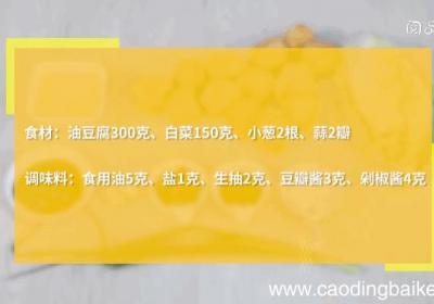 步骤1【白菜煮油豆腐的做法 白菜煮油豆腐怎么做】准备食材:油豆腐300克、白菜150克、小葱2根、蒜2瓣、食用油5克、盐1克、生抽2克、豆瓣酱3克、剁椒酱4克 。步骤2油豆腐洗净、对半切开 。步骤3白菜洗净、切段 。步骤4小葱切葱花 。步骤...