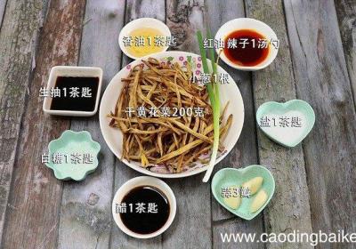 步骤1准备食材:干黄花菜200克、盐1茶匙、蒜3瓣、生抽1茶匙、白糖1茶匙、醋1茶匙、香油1茶匙、红油辣子1汤勺、小葱1根步骤2干黄花菜浸泡10分钟切 。步骤3蒜切末 。步骤4小葱切葱花 。步骤5首先起锅倒水,水开将黄花菜煮5分钟捞出捏干水...