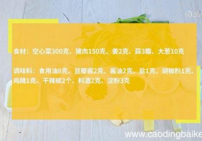 步骤1食材:空心菜300克,猪肉150克,姜2克,蒜3瓣,大葱10克、食用油8克,豆瓣酱2克,酱油2克,盐1克,胡椒粉1克,鸡精1克,干辣椒2个,料酒2克,淀粉3克 。步骤2空心菜摘去梗,叶尖留用 。步骤3猪肉切片 。步骤4加入料酒、淀粉,...