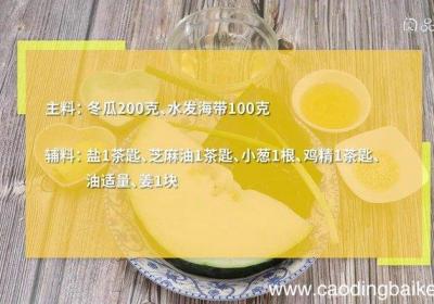 步骤1准备材料:冬瓜200克、水发海带100克、盐1茶匙、芝麻油1茶匙、小葱1根、鸡精1茶匙、油适量、姜1块 。步骤2冬瓜去皮洗净切块 。步骤3海带切段 。步骤4姜切片 。步骤5小葱切葱花 。步骤6起锅倒油,油热加入姜爆香 。步骤7然后加入...