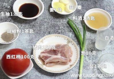 步骤1准备食材:猪肉150克,西红柿100克,胡椒粉1茶匙,生抽1汤匙,姜1块,蒜2瓣,料酒1汤匙,白酒10克,葱10克,盐1茶匙 。步骤2蒜切末 。步骤3姜切末 。步骤4葱切葱花 。步骤5猪肉剁成泥 。步骤6西红柿对半切开,将西红柿肉汁挖...