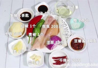 步骤1主料:鱿鱼200克 。辅料:土豆50克、青椒1个、红椒1个、洋葱50克、葱1段、姜1块,蒜3瓣、生抽1茶匙、蚝油1茶匙、干辣椒20克、豆瓣酱1茶匙、糖1茶匙、油适量 。步骤2鱿鱼撕掉外皮,清洗干净,打上花刀切小块,土豆切片,青椒切段,...