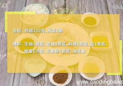 步骤1准备材料:鸡腿200克、米饭1碗、生抽1茶匙、老抽1茶匙、料酒1茶匙、盐1茶匙、蜂蜜1汤匙、五香粉1茶匙、油适量 。步骤2鸡腿洗净,打上花刀备用 。步骤3碗中放入鸡腿、料酒、老抽、盐、五香粉,拌匀腌制10分钟 。步骤4起锅倒油,油温6...