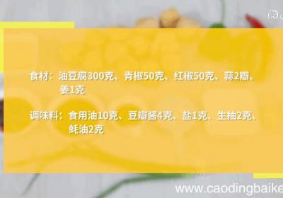 步骤1准备食材:油豆腐300克、青椒50克、红椒50克、蒜2瓣、姜1克、食用油10克、豆瓣酱4克、盐1克、生抽2克、蚝油2克 。步骤2油豆腐洗净、对半切开 。步骤3青椒切块 。步骤4红椒切块 。步骤5蒜切片 。步骤6姜切片 。步骤7热锅倒油...