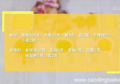 步骤1食材:猪脚400克、大葱10克、姜3克、蒜2瓣、干辣椒5个、小葱2根调味料:食用油20克、生抽3克、老抽1克、白糖2克、椒盐粉1克、盐2克步骤2锅中水沸后、放入猪脚、焯水15分钟、捞出 。步骤3大葱切段 。步骤4姜切片 。步骤5干辣椒...