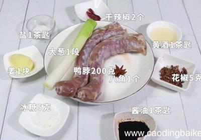 步骤1准备食材:鸭脖200克、八角1个、大葱1段、黄酒1茶匙、冰糖5克、花椒5克、姜1块、盐1茶匙、干辣椒2个、酱油1茶匙 。步骤2鸭脖洗净剁成段 。步骤3大葱切段 。步骤4姜切片 。步骤5干辣椒切段 。【酱制鸭脖的做法 酱制鸭脖怎么做】步...