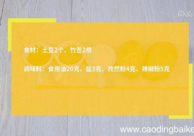 步骤1食材:土豆2个、竹签2根、食用油20克、盐3克、孜然粉4克、辣椒粉5克 。步骤2土豆去皮 。步骤3修整为长方形 。步骤4用筷子夹住土豆、直刀切薄片 。步骤5再将土豆翻面、斜刀写薄片、用竹签串好 。步骤6热锅倒油、油温6成热时、下土豆串...