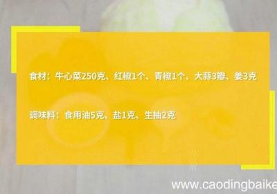 步骤1食材:牛心菜250克、红椒1个、青椒1个、大蒜3瓣、姜3克、食用油5克、盐1克、生抽2克 。步骤2牛心菜撕成块 。步骤3红椒切块 。步骤4青椒切块 。步骤5大蒜切粒 。步骤6姜切片 。步骤7炒锅中油温5成热时,下入蒜粒、姜片爆香 。【...