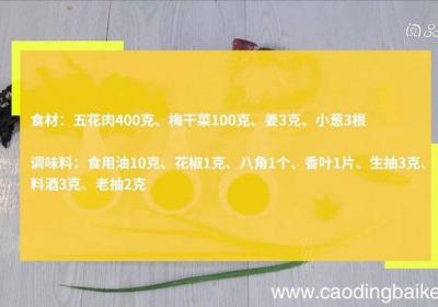 步骤1食材:五花肉400克、梅干菜100克、姜3克、小葱3根 。调味料:八角1个、香叶3片、生抽3克、料酒3克、老抽2克 。步骤2梅干菜洗净,挤干水分,切碎 。步骤3锅中水沸,放入五花肉、姜、小葱、料酒,大火煮20分钟,捞出,肉皮均匀抹上老...