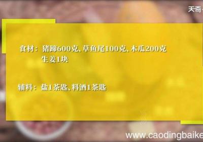 步骤1食材:猪蹄600克,草鱼50克,木瓜200克,生姜1块 。调料:盐1茶匙,料酒1茶匙 。【木瓜鱼尾猪蹄汤怎么做 木瓜鱼尾猪蹄汤】步骤2猪蹄剁成块 。步骤3姜切片 。步骤4木瓜去皮、去籽,切成小块 。步骤5锅中沸水,放入猪蹄,加入料酒,...