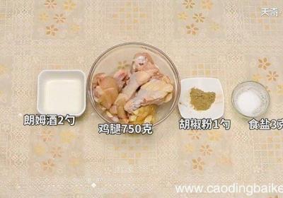 步骤1准备食材:鸡腿750克、朗姆酒2勺、胡椒粉1勺、食盐3克 。步骤2腿洗净,用牙签在鸡腿上扎一些小孔 。步骤3涂上朗姆酒,均匀的抹上盐 。步骤4盖保鲜膜冷藏1小时 。步骤5将鸡腿放入烤盘,撒上胡椒粉 。步骤6烤箱200度,烤30分钟至表...