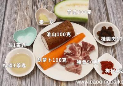 步骤1准备食材:节瓜200克、淮山100克、胡萝卜100克、枸杞5克、桂圆肉10克、姜片1块、料酒1茶匙、盐1茶匙 。步骤2节瓜洗净切片备用 。步骤3姜切片 。步骤4胡萝卜切块 。步骤5淮山切块 。步骤6猪骨洗净备用 。步骤7枸杞用温水浸泡...